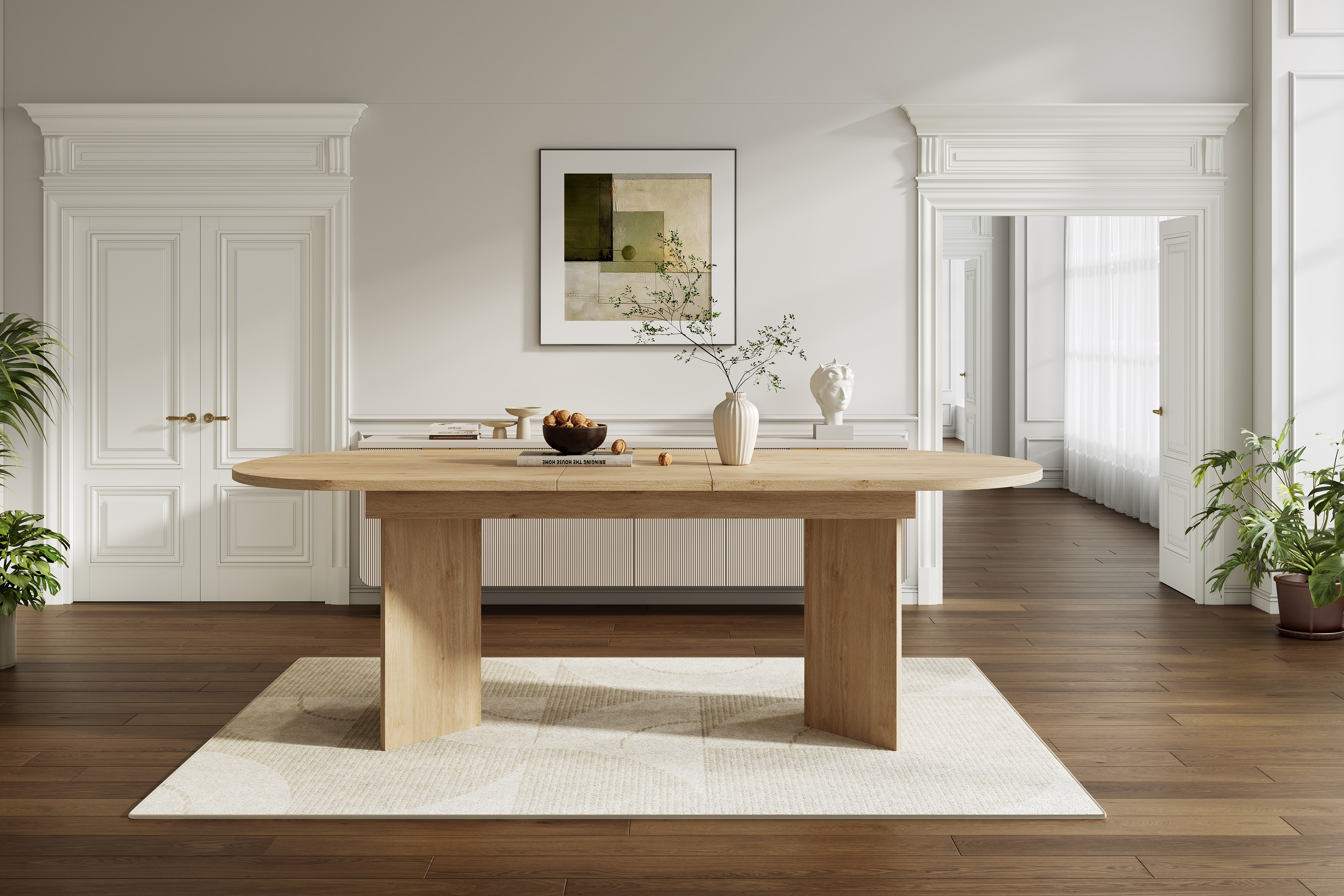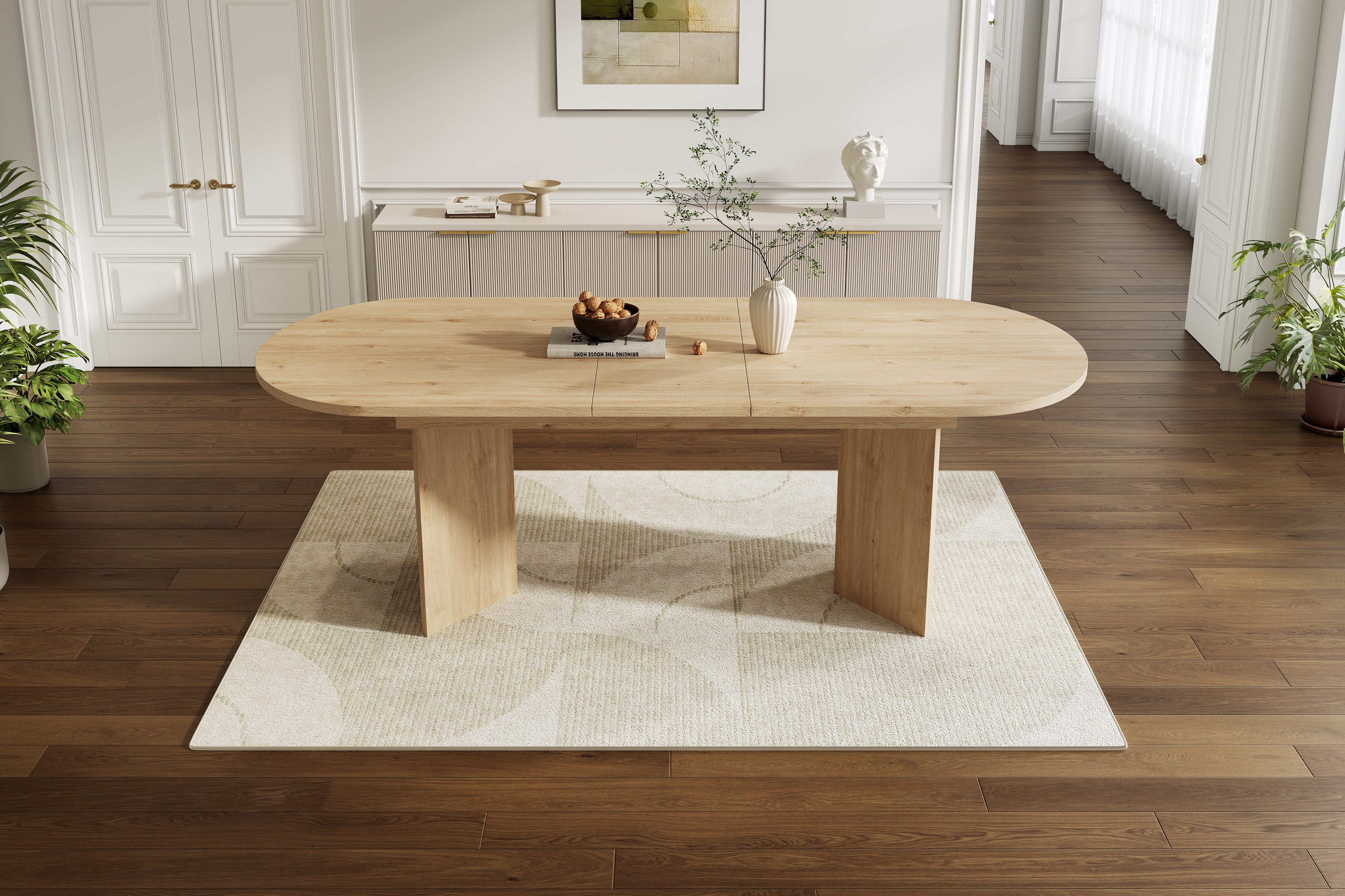 Modern extendable dining table in natural oak finish with 18mm thickened tabletop and rounded corners. Extends from 160cm (4-6 people) to 200cm (6-8 people).