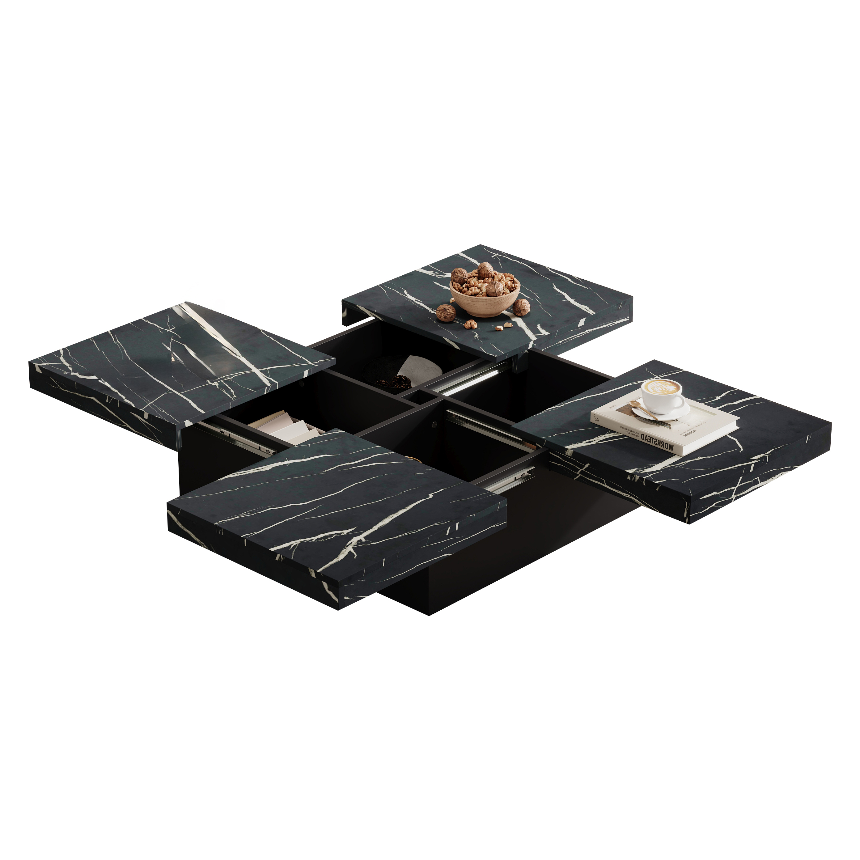 Stylish 90x90x25cm square coffee table with faux marble tabletop and 4 hidden sliding drawers. Perfect modern accent for living rooms, offices, or apartments. Compact size fits small spaces while sliding tabletop reveals storage for remotes, books, and coasters.