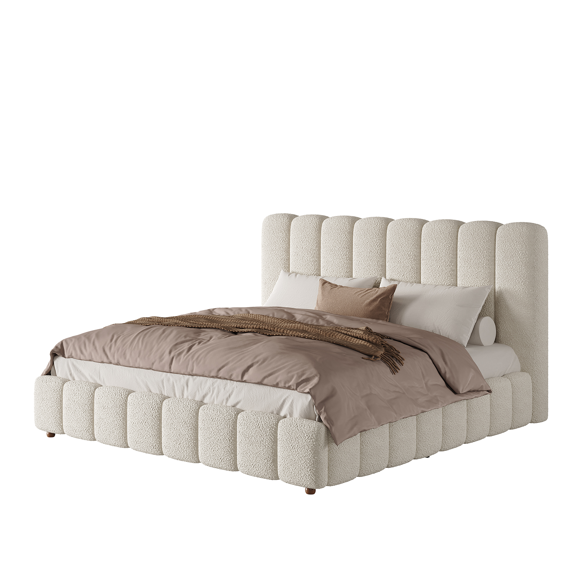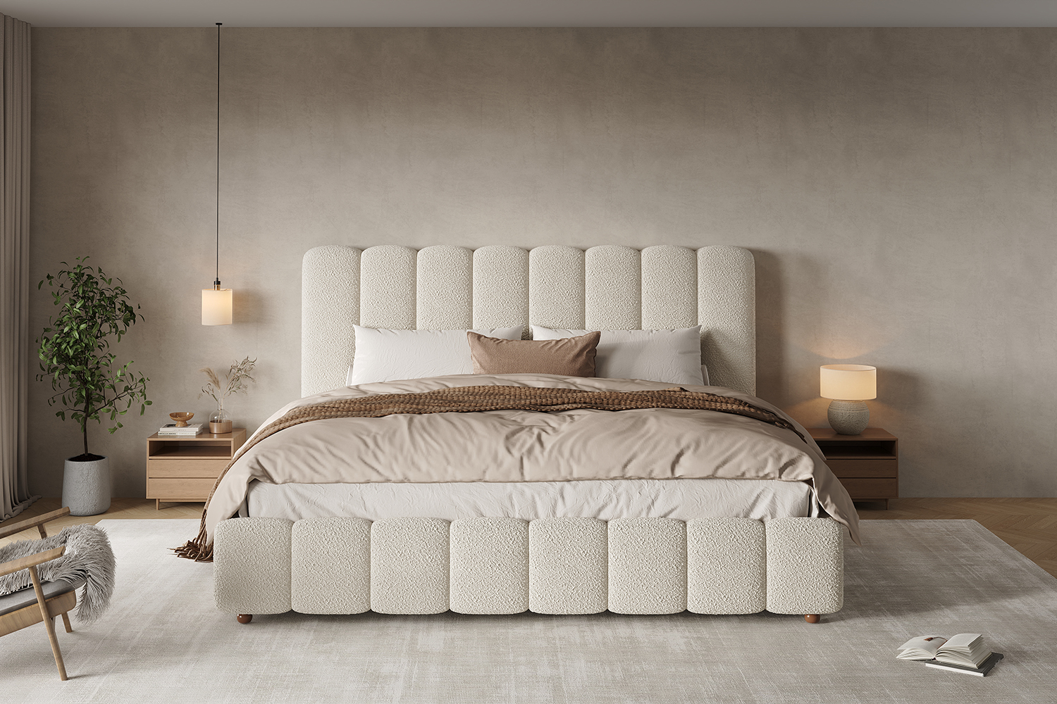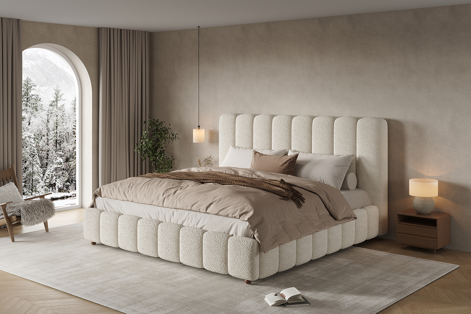- Deep padded, vertically stitched headboard in soft bouclé fabric