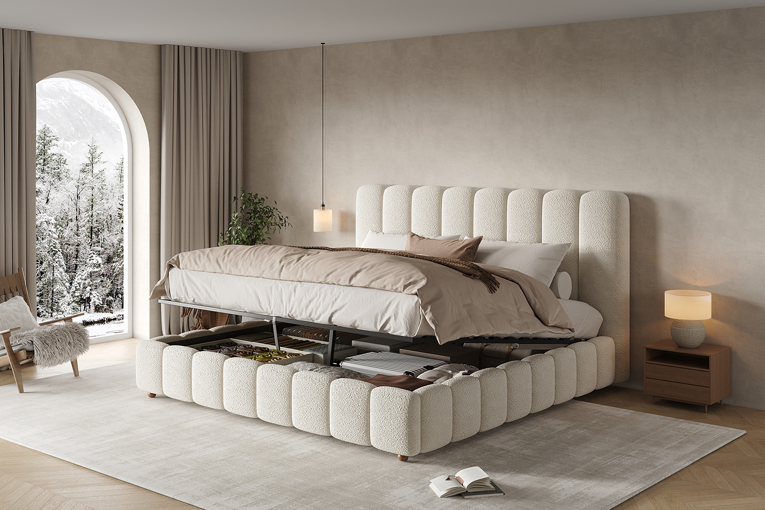 Modern king size upholstered bed in white bouclé fabric with hydraulic lift storage and slatted frame included. Large under-bed storage compartment accessed easily from the foot of the bed. Padded headboard provides comfortable back support for reading and relaxing.